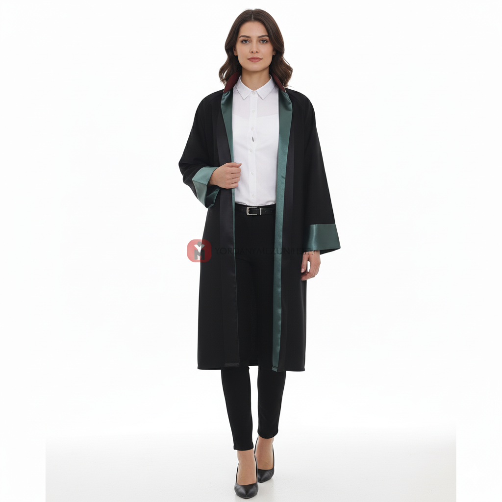 Avukat cübbesi modellerimiz bütün özellikleri baro tarafından belirlenen mevzuata göre üretilmektedir. Cübbenin yeşil kısmı hukuk davalarını, kırmızı kısmı ceza davalarını temsil eder. Kamu hizmeti olduğundan cübbenin cepleri, bağımsız olduğundan düğmeleri yoktur. Beş farklı beden olarak stoklarımızdan gönderim yapabiliriz veya kişiye özel ölçüleriniz ile tam vücudunuza uygun şekilde üretim yapabilmekteyiz.